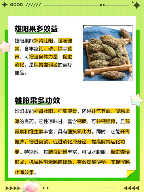 5、葵力果的功效与作用主要包括壮阳补肾和调理身体。 壮阳补肾: 葵力果中的主要成分如淫羊藿能够温补壮阳,有效改善因肾阳不足或肾阳虚而引起的四肢发冷等症状。 对腰膝酸软等症状也有良好的调理效果,有助于提升男性的肾功能。